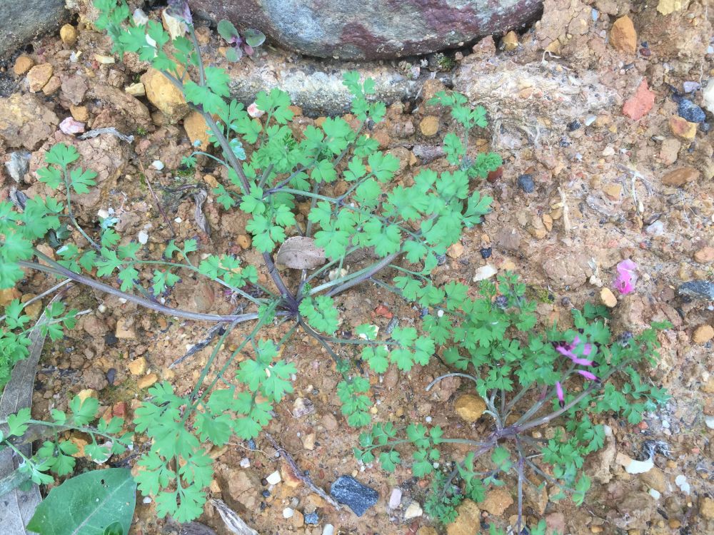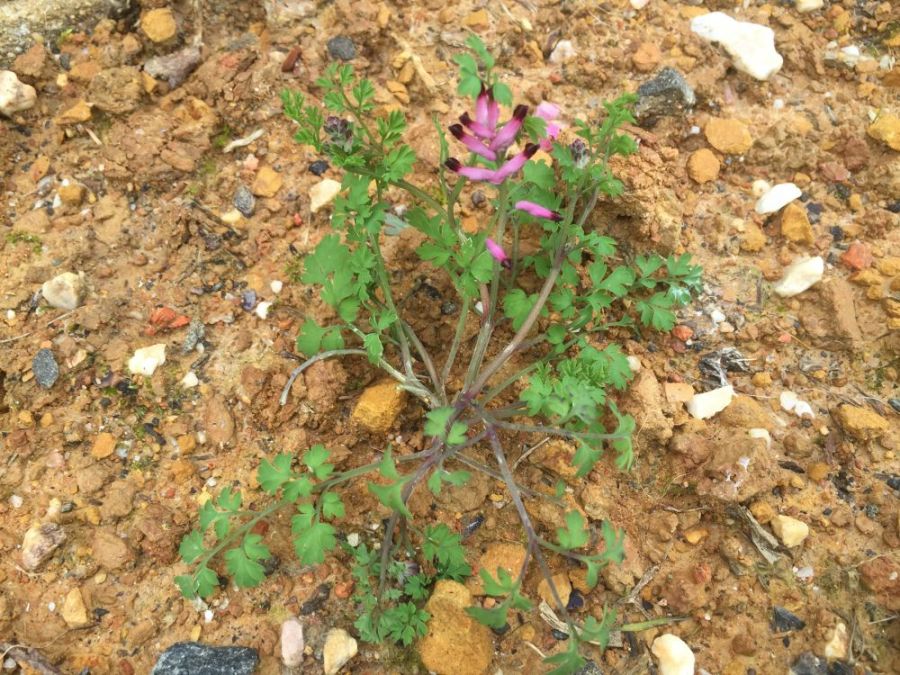 As a general description, Fumitory species are a semi erect, sprawling plant with deeply lobed, hairless leaves. The leaves are attached to branched stems which are also hair less and are five sided.