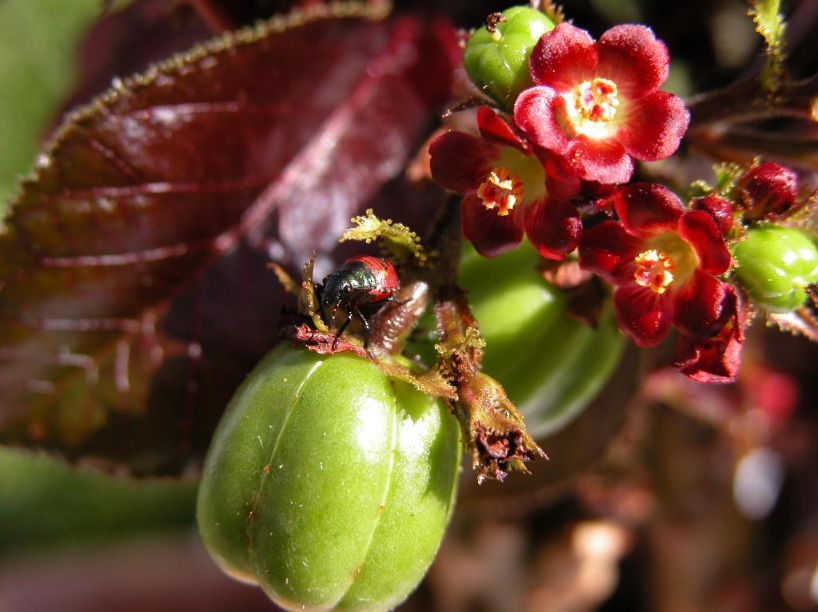The flowers are small, red with yellow centres.