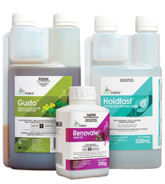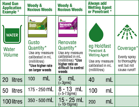 The example below uses the GUSTO herbicide rate required for hard to control woody weeds and the RENOVATE herbicide & HOLDFAST penetrant and wetting agent rates for bracken/blackberry and other hard to kill woody & noxious weeds in native grass pastures*