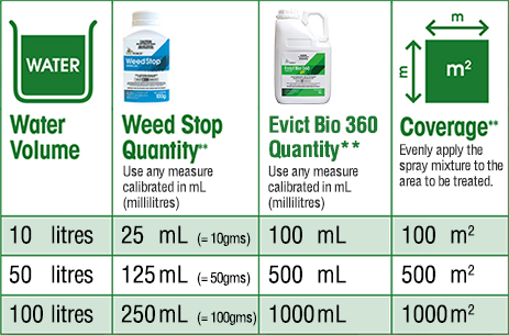 When using Weed Stop Herbicide for application by ground spraying equipment only. Use a boom spray (boomless or off-centre nozzle if necessary) properly calibrated to a constant speed and rate of delivery to ensure thorough coverage and a uniform spray pattern and rate of application over the area to be treated.